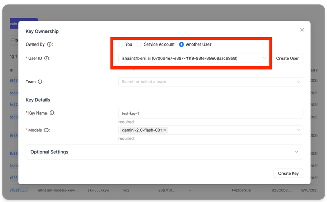 On the LiteLLM Proxy UI, go to Virtual Keys > Create API Key > Select User ID